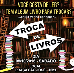 Tem livros em casa que já leu e está disposto a trocá-los por outros, mas não sabe onde fazer isso? Pois saiba que seus problemas acabaram. Acontece neste sábado (16h), na praça São José, a “troca de livros”. Daí é só só achar alguém que esteja disposto a trocar de livro com você. A proposta surgiu de um grupo de amigo e já teve algumas edições realizadas em Campo Mourao. Agora está de volta.