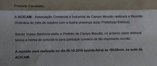 “Sendo Vossa Senhoria eleito prefeito de Campo Mourão temos a hora de convidá-lo para participar conosco (...)”, frisa o ofício.