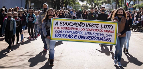 O primeiro protesto durante o desfile foi de estudantes do colégio Unidade Polo. Eles desfilaram usando mordaças. Foi um protesto contra o projeto “escola sem partido”, que quer tirar o debate político das escolas. “... Desrespeito do governo do Paraná com a comunidade intelectual das escolas e universidade”, destacava uma faixa. “A mentira, a ignorância e a disputa ideológica”, dizia outra. A escola também lembrou o “29 de abril”.