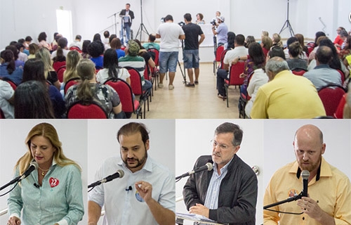 Apenas os candidatos falaram – um de cada vez, sem debate -. Na mesa principal, os prefeitáveis puderam levar um acompanhante. Regina Dubay foi com Nelson Tureck; Rodrigo Salvadori com Pedrinho Nespolo; Tauillo Tezelli com Arno Ferrari e Professor Evaldo com André Luiz Alves.