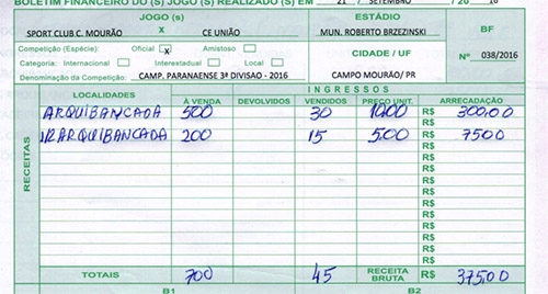 Saiu o borderô de Sport 1 x 3 União de Francisco Beltrão, pela terceira divisão do Campeonato Paranaense. O jogo foi disputado quarta-feira à tarde no estádio Roberto Brzezinski. Deu 45 pagantes (30 pagaram inteira e 15 meia), totalizando uma renda de R$ 375. O prejuízo administrativo da partida foi de R$ 3,9 mil. Somente a remuneração da arbitragem é de R$ 1,9 mil.