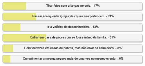 “Tirar fotos com crianças no colo” teve 17% e “Ir a velórios de desconhecidos” 13%.