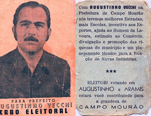 Material de campanha do candidato a prefeito Augustinho Vecchi, nas eleições municipais de 1972. Aramis Meyer Costa foi o candidato a vice-prefeito. O vencedor foi o advogado Renato Fernandes Silva. Pelas promessas do santinho, dá pra notar que, 44 anos depois, as prioridades praticamente são as mesmas...