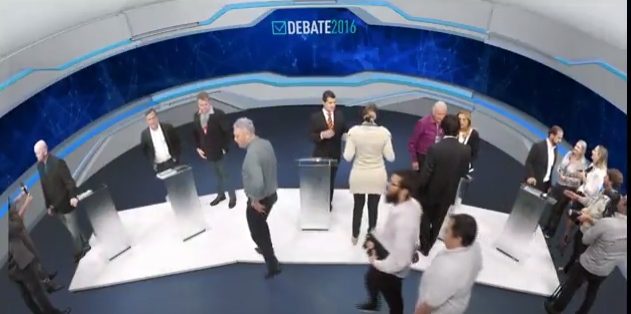 O clic é de Cascavel, onde foi realizado na TV Tarobá o debate entre os quatro candidatos a prefeito de Campo Mourão. Regina Dubay (PR), que tenta a reeleição, teve como um dos assessores o ex-prefeito Nelson Tureck (PEN), que é seu candidato a vice-prefeito.