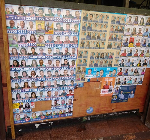 Tem gente que não gosta de propaganda política. Se irrita com horário eleitoral, com carro de som e com santinhos. Por outro lado, não falta quem faça até coleção. Outros criam painéis com os materiais de propaganda. Esse aí fica num comércio da rua Engenheiro Mercer, que dá acesso ao jardim Cidade Nova. Os santinhos foram coladas devidamente separados por coligação. Tá pensando o quê!...