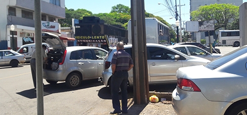 “Gostaria de saber por onde o pedestre passa. Foto tirada na rua Harrison José Borges, quase esquina com a av. Irmãos Pereira. Não existe fiscalização no transito de Campo Mourão?”