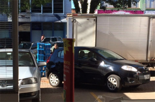 “Carro tentando sair do estacionamento da farmácia e o caminhão obstruindo a saída”.