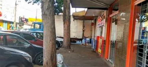 Tarde de sábado, véspera de feriadão, comércio de Campo Mourão aberto em horário especial, mas como é que o pedestre passa pela calçada da rua Mato Grosso, centrão da cidade, com caminhão fazendo descarga atravessado desse jeito?