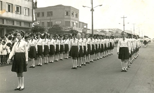 Desfile de aniversário de Campo Mouão, com estudantes milimetricamente enfileiradas na av. Capitão Índio Bandeira. A foto é da esquina com a rua Brasil (ao fundo os prédios onde hoje ficam a BM Calçados e a Ótica Veneza).