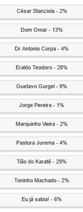 Venceu Tião do Karatê, com 29% dos votos, seguido de pertinho por Eraldo Teodoro, com 28%.