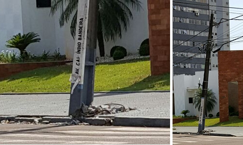 “Av. Capitão Índio Bandeira, esquina com rua Guarapuava. Alguma coisa bateu feio no poste de luz, que ficou todo torto, estilo “poste de Pisa”.