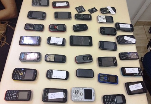 Parece mostruário de loja revendedora de celulares. Parece, mas não é. Esses aí são os 31 aparelhos de telefones móveis que foram encontrados nesta terça-feira dentro da cadeia de Goioerê. A operação bate-grade contou com 23 policiais. Tinha celular escondido de todo jeito, até dentro de “falso livro”.