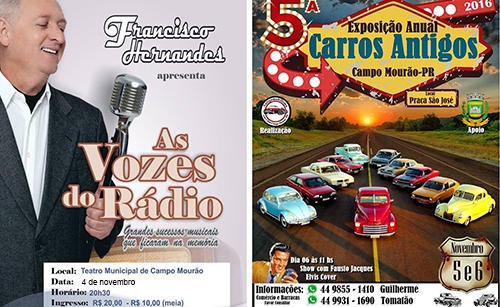 Sábado e domingo – Campo Mourão promove o 5ª Exposição Anual de Carros Antigos. Será na praça São José, numa promoção do Clube do Antigomobilismo. No domingo (11h) Fausto Jacques se apresenta em show do “Elvis Cover”.