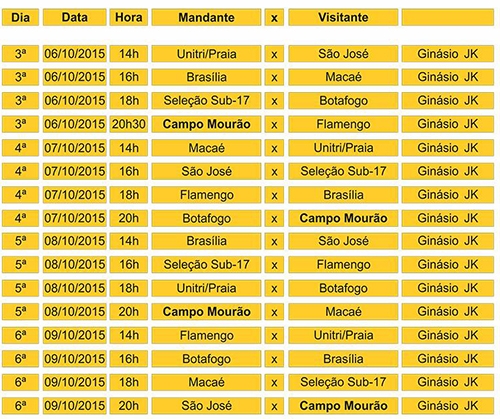 Campo Mourão enfrenta nesta terça (20h30) o Flamengo/RJ. Depois tem o Botafogor/RJ (quarta, 20h), Macaé/RJ (quinta, 20h) e São José/SP (sexta, 20h). A entrada custa R$ 10.
