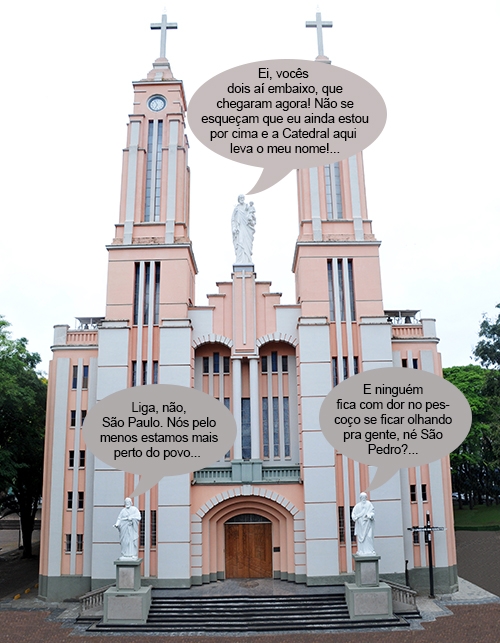 Olha aí como ficou a vista da Catedral São José após a instalação das imagens de São Pedro e de São Paulo. Os santos fundadores da Igreja Católica ficam na entrada da Catedral, enquanto o São José, que chegou antes, segue no alto, entre as torres, afinal, ele é o padroeiro do município. No mais, que fique claro: o balãozinho é só uma brincadeira. Deus perdoa, né?...