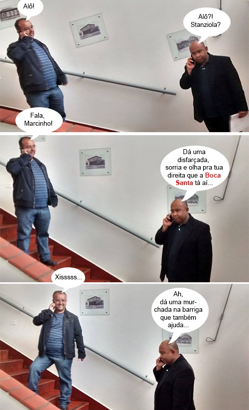 Os cliques foram feitos durante a semana, nas escadas do Paço Municipal. Os secretários Cesar Stanziola (Obras) e Márcio Alencar (Saúde) conversam ao telefone. Não estavam falando um com o outro, certamente. Ou será que estavam?...