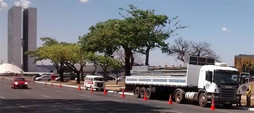 O Congresso Nacional, ao fundo, não deixa dúvidas: a foto vem de Brasília. E olha só o que está por ali, no coração da capital federal: uma enorme carreta. Ah, se em Brasília pode...