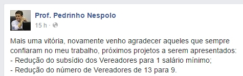 O vereador Pedrinho Nespolo está usando as redes sociais para anunciar os próximos projetos que vai apresentar.