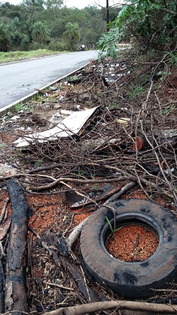"Lixo jogado às margens da estrada para o Barreiro das Frutas, nos fundos do Parque do Lago. Repare que ao fundo é possível ver o pontilhão sobre a barragem do Rio do Campo".