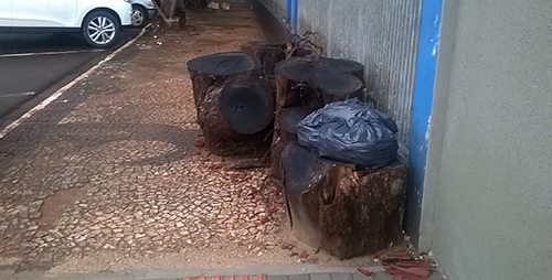 “Na rua Interventor Manoel Ribas as árvores de um trecho da calçada foram derrubadas faz tempo (será que precisava?), mas parte do que restou dos tocos continua no local”.
