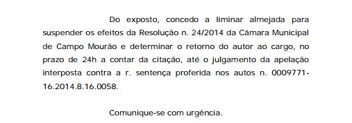 O Tribunal de Justiça concedeu liminar nesta sexta-feira determinando a volta de Pedrinho Nespolo à Câmara.