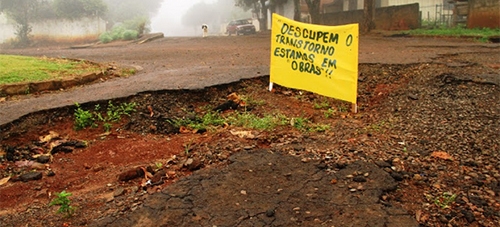 Em Engenheiro Beltrão, moradores fizeram um protesto irônico com a situação da av. Zacarias de Góes. “Desculpem o transtorno, estamos em obras!”, diz a faixa. A via foi asfaltada, mas o asfalto não demorou quase nada. O caso virou uma batalha judicial entre a prefeitura e a empresa responsável pela construção.