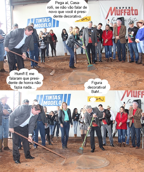 Os cliques são deste domingo, na hora da retirada simbólica do "buraco número um" na Festa Nacional do Carneiro no Buraco. Devido à chuva, o ritual foi improvisado no Pavilhão dos Buracos, sem muito glamour. A prefeita Regina Dubay, o presidente de honra Névio Hanel e o presidente da festa, Nelson Casarolli, pegaram na enxada e na vassoura. Ah, pensa que é só comer, é?...