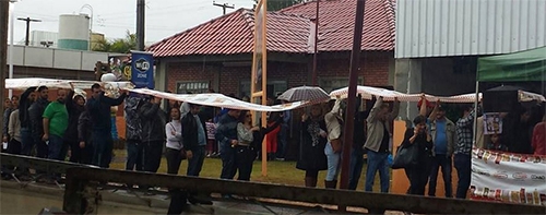 E é verdade! Apesar da treguazinha na hora do almoço, choveu um pouco, sim, quando ainda tinha gente na fila da Festa Nacional do Carneiro no Buraco. O pessoal que aguardava a vez na barraca do Rotary improvisou um “guarda-chuva coletivo”.
