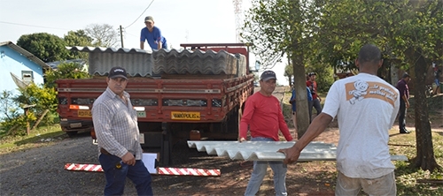 Foram entregues nesta segunda-feira as primeiras 300 telhas para os moradores de Bredápolis (Janiópolis) que tiveram casas danificadas pela chuva de granizo. Segundo o prefeito Lola Poera, outras 500 devem chegar nesta terça-feira.