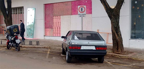 “Carro estaciona na vaga destina a motocicletas. O flagra é da rua Harrison José Borges, em frente ao Bradesco, nesta sexta-feira”.