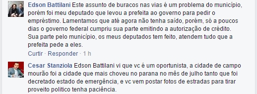 “Campo Mourão foi a cidade que mais choveu no Paraná no mês de julho, tanto que foi decretado estado de emergência, e você vem postar fotos de estradas para tirar proveito politico”.