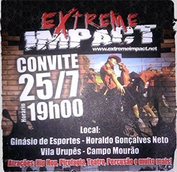 Acontece neste sábado (19h), no ginásio da Vila Urupês, o último dia do projeto Extreme Impact em Campo Mourão. Entre as atrações, hip hop, pirofagia, teatro e percussão. A entrada é franca.