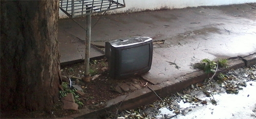 Aparelho de televisão (provavelmente estragado) é deixado sobre a calçada, em avenida da área central, sendo que existe coleta específica para esse tipo de eletrônico.