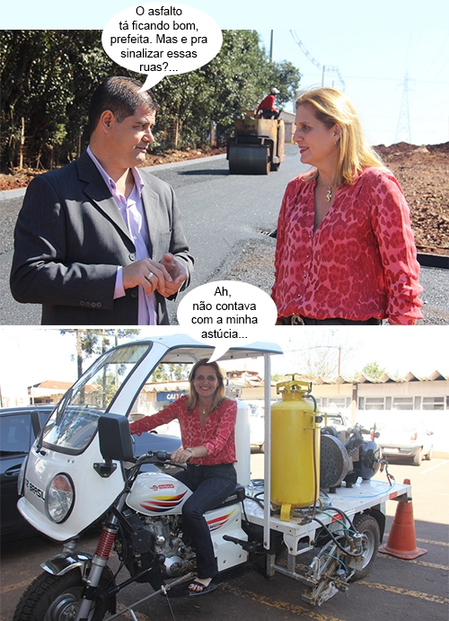 A primeira foto é do jardim Cidade Nova, onde a prefeita Regina Dubay e o vereador Jorge Pereira foram conferir o asfalto que está sendo feito por lá. Na foto de baixa, Regina experimenta o triciclo adquire pela prefeitura para agilizar a pintura sinalização horizontal, como faixas de segurança.