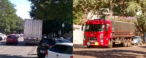 Tem horas que parece provocação. O caminhão à esquerda está parado em fila dupla na rua Brasil, bem em frente à prefeitura. Isso às 11h30. Já à direita, o caminhão estacionou na frente da casa da prefeita Regina Dubay, às 10h40. Os flagras são desta segunda-feira.