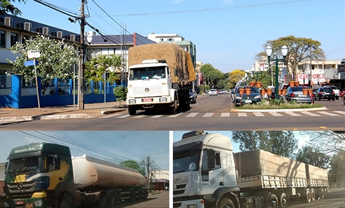 Três flagras desta segunda-feira em Campo Mourão. 1) Caminhão na av. Capitão Índio Bandeira, no trecho revitalizado pela prefeitura. 2) Carreta na rua Santa Catarina. 3) Bitrem na av. Guilherme de Paula Xavier.