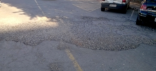 Buraco pela rua é o que não falta em Campo Mourão. Agora, quem tiver por perto de casa um buraquinho maior que esse da rua Edmundo Mercer, entre as avenidas Capitão Índio Bandeira e Manoel Mendes, que atire a primeira pedra. Menos mal que não é fundo, mas atravessa a rua quase inteira. Os carros ficam pequenos perto dele. Como diria Osmar Santos: "Animal esse buraco!"...