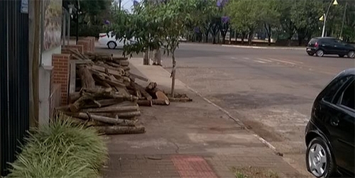 “Rua Rocha Pombo, entre as avenidas Irmãos Pereira e Capitão Índio Bandeira: lenha é deixada na calçada e não deixa espaço para passagem dos pedestres. Infelizmente, cena comum em Campo Mourão”.