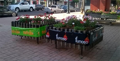 “Floreiras do calçadão, no centro de Campo Mourão, são ‘revestidas’ com faixas de propaganda de bebidas”.