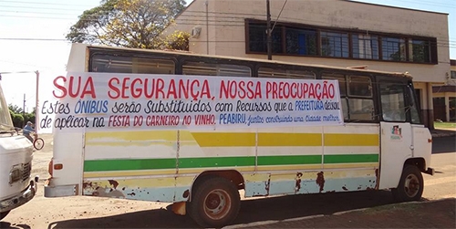 Em dois ônibus velhos do transporte escolar, uma faixa dizia que eles serão substituídos com o dinheiro que seria usado na festa.