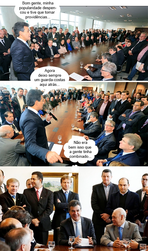 Os cliques são desta terça-feira, no Palácio Iguaçu, em Curitiba, quando o governador Beto Richa se reuniu com um grupo de prefeitos e anunciou recursos para pedras irregulares. Deputados e secretários também participaram. O presidente da Codapar, Tino Staniszewski, por exemplo, ficou bem atrás da cadeira do governador.