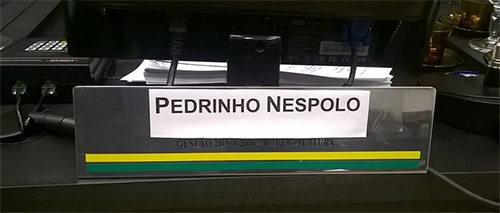 O vereador Pedrinho Nespolo reassumiu sua cadeira na Câmara após nove meses, mas ainda está sem uma plaquinha de identificação no plenário. Nas sessões desta segunda e terça-feira foi usada uma placa improvisada, com o nome dele impresso em folha de papel e colocado sobre a placa metálica. Ai-aiai-aiai! Não estavam acreditando que ele iria voltar ou não estão acreditando que ele vá ficar muito tempo?...