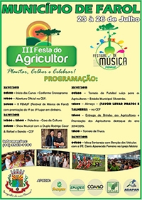 Farol – A prefeitura vai realizar de 23 a 26 deste mês a 3ª Festa do Agricultor. O evento inclui palestras, cursos, torneio de futebol suíço, torneio de truco, festival de música, missa sertaneja com bênção de veículos e show artístico.