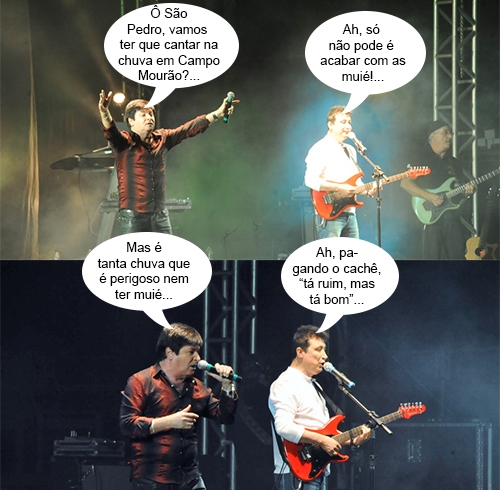 O show com Munhoz & Mariano ficou para a próxima segunda-feira, mas a Festa do Carneiro no Buraco segue nesta quarta e o show do dia é com Gilberto & Gilmar. É a dupla das músicas “Nós não vive sem muié” e “Tá ruim, mas tá bom”. Se o Simepar não errar na previsão, vai chover na hora da apresentação. Ô gente, a chuva atrapalha, mas o show é de graça. Portanto, tá ruim, mas tá bom...
