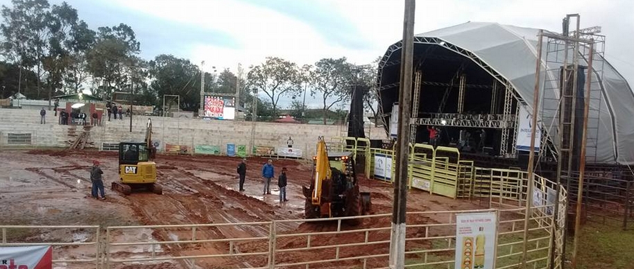 A prefeitura colocou ônibus e máquinas na arena do Parque de Exposições, na tarde desta quarta-feira, para dar uma ajeitada no local visando a programação da noite. Tem rodeio e show com Gilberto & Gilmar nesta quarta-feira e a arena estava uma lama só.
