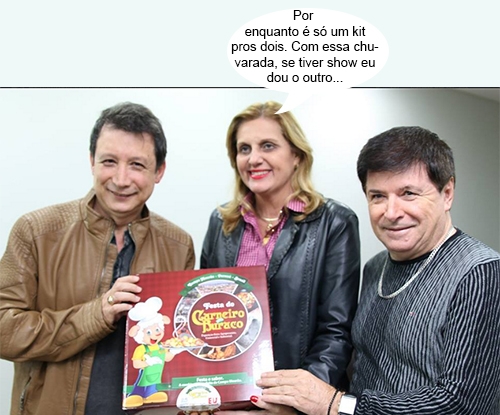 São Pedro insiste em não colaborar, mas a programação da Festa do Carneiro no Buraco segue em pé. A dupla Gilberto & Gilmar chegou à tarde à cidade e já recebeu a visita da prefeita Regina Dubay. E ela não foi de mãos vazias, não. Levou um kit da festa e entregou de presente para os irmão cantores. Ih, mas foi um só para os dois? Ah, tá ruim, mas tá bom...