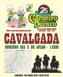 A Festa Nacional do Carneiro no Buraco será aberta oficialmente na terça-feira (olha lá, hein São Pedro). Neste domingo, porém, tem a cavalgada alusiva ao evento. São esperados cerca de mil cavaleiros e amazonas. Eles vão percorrer 12 km saindo do Parque de Exposições e passando pelo centro da cidade, com direito a paradinha no Recanto dos Tropeiros. A cavalgada terminar com almoço. No mais, os cavalos serão avisados para não deixarem “rastros” pelo caminho, né?...