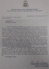 O bispo d. Javier Paredes enviou ofício aos vereadores de Campo Mourão.