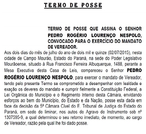 ...e mostrando a “bicha” morta. Esse não é o lema de Boca Santa? Olha aí o termo de posse que Pedrinho Nespolo assinou às 12h03 de quinta-feira, quando, oficialmente, reassumiu sua cadeira na Câmara. O termo foi publicado nesta sexta-feira no “Órgão Oficial do Município”. Na mesma edição saiu o “termo de revogação de posse” do primeiro suplente Edson Lima.