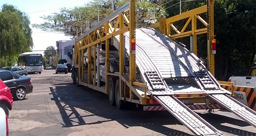 “Caminhão-cegonha para no meio da rua Santos Dumont para fazer a ‘descarga’ de um carro. Foi às 11h40 desta segunda-feira. Repare ao fundo que o ônibus escolar precisou esperar a operação terminar para poder passar”.